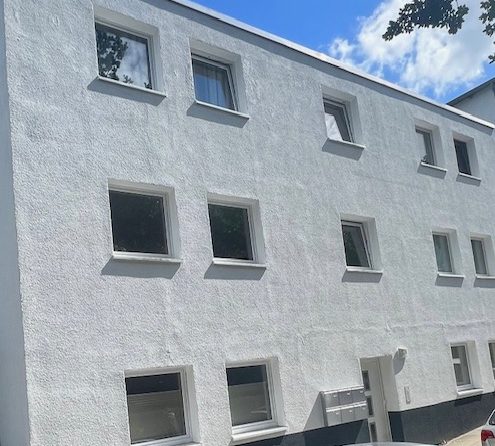 -Fassade mit Wärmedämmverbundsystem (WDVS), - heller Außenputz